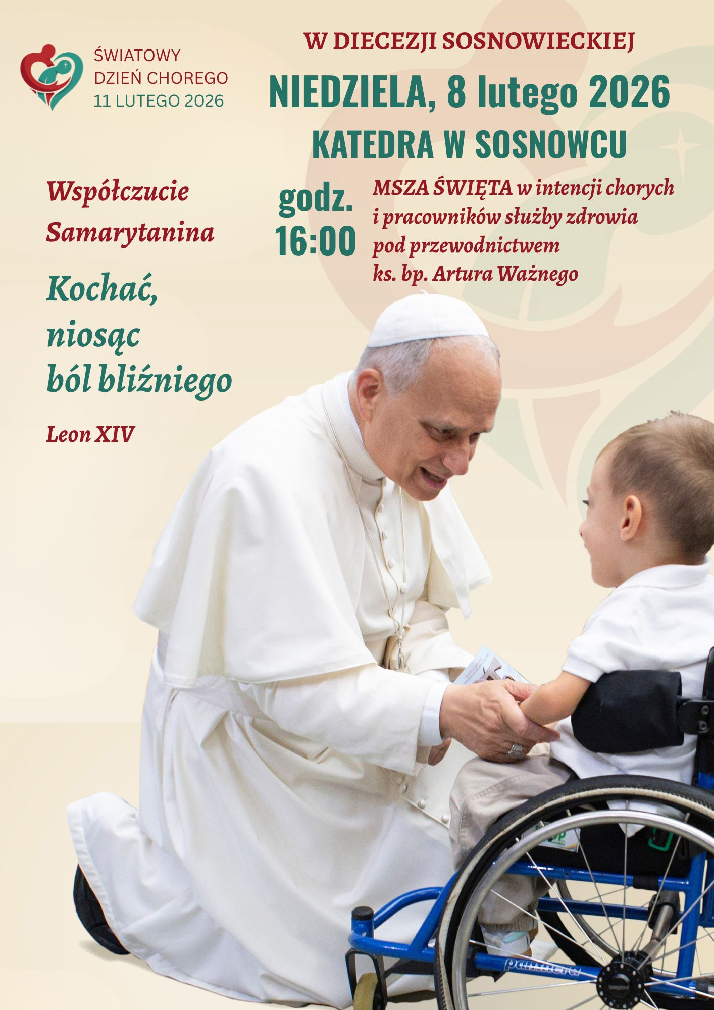 Światowy Dzień Chorego będzie świętowany także w diecezji sosnowieckiej w katedrze pw. Wniebozięcia NMP w Sosnowcu w niedzielę 8 lutego 2026 r. W tym dniu o godz. 16.00 ks. bp Artur Ważny bedzie sprawował Mszę św. w intencji chorych, ich bliskich oraz pracowników służby zdrowia.
